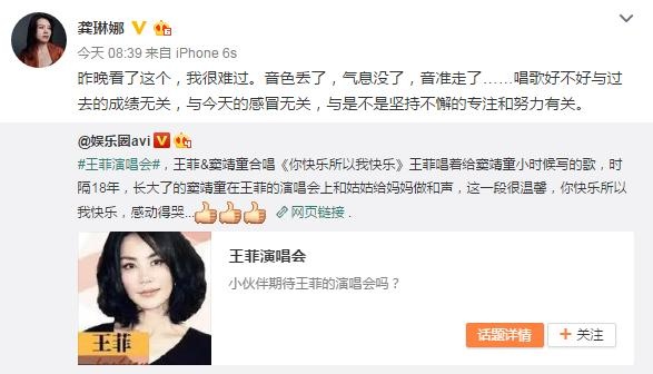 王菲演唱会走调,连龚琳娜都看不过眼了。31日上午,龚琳娜转发一条王菲演唱会的微博,并附文称:“昨晚看了这个,我很难过。音色丢了,气息没了,音准走了……唱歌好不好与过去的成绩无关,与今天的感冒无关,与是不是坚持不懈的专注和努力有关。”