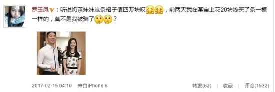 如果凤姐真的在某宝上用20块钱买了一条一模一样的裙子,那岂不直接暴露了某宝是假货的天堂,相信某宝绝不会答应,弄不好要吃官司的。看得出来,凤姐明显是冲着奶茶妹妹来的,网友对凤姐刻意贬低他人的行为表示不满:“以前只是觉得你长得不美,现在发现你是相由心生。”