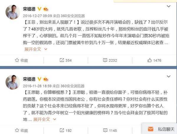 宋祖德骂人几乎不看对方背景,什么人都敢骂,比如一向低调很少露面的天后王菲,他都不放过,号称“国民老公”、娱乐圈的“纪检委”王思聪他也敢骂,甚至脾气火爆、有“钢炮”之称的冯小刚他也毫不畏惧。