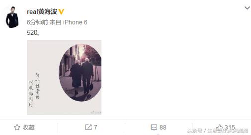 5月20日这天,久未露面的黄海波发了一条微博,只有三个数字:“520”。下面配了一张图文,一对老人牵手相依,图上附上一句话:“有一种幸福叫风雨同行!”