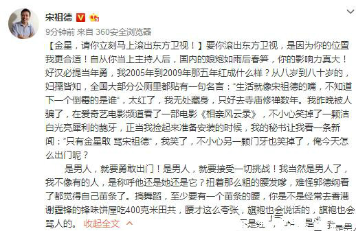 5月27日早上,“大嘴”宋祖德在微博怒斥金星:“金星,请你立刻马上滚出东方卫视!”宋祖德说道“要你滚出东方卫视,是因为你的位置我更合适!自从你当上主持人后,国内的娘炮如雨后春笋,你的影响力真大!”