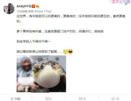 13日下午,黄毅清在微博发文称:“这世界,有本钱就可以找更美的,更善良的;没本钱就只能照更丑的,素质更差的。萝卜青菜各有所爱,这素质是挺门当户对的,祝福你们。”疑似回应前妻黄奕的新恋情,但之后又秒删了该微博。
