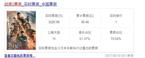 截至8月9日上午8:55,上映14天的《战狼2》票房已经突破36.6亿,已经远远超越《美人鱼》33.9亿总票房,刷新中国影史票房纪录。且仍已每天2亿多的票房一路猛涨。因此完全可以断定,《战狼2》提前锁定2017电影票房年度冠军。