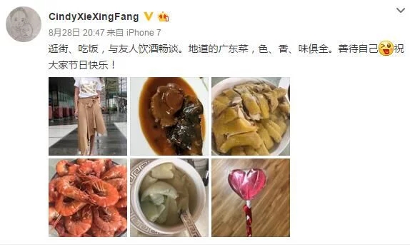 8月28日,林丹妻子谢杏芳在微博晒出七夕美照,照片中的她穿衣走知性风,大长腿十分抢眼,她还晒出美食小吃,最后一刻心的图片亮了。谢杏芳还配文称:“逛街、吃饭,与友人饮酒畅谈。地道的广东菜,色、香、味俱全。善待自己,祝大家节日快乐! ”