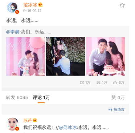 9月16日1点,李晨在微博晒出求婚范冰冰的照片,并配文:我们,永远。范爷随即在微博回应道:永远,永远。甜蜜的样子让人感动。随后郑恺,王祖蓝,陈赫,何炅等一众圈内艺人送来祝福,更有网友调侃:幸好女主不是张馨予。