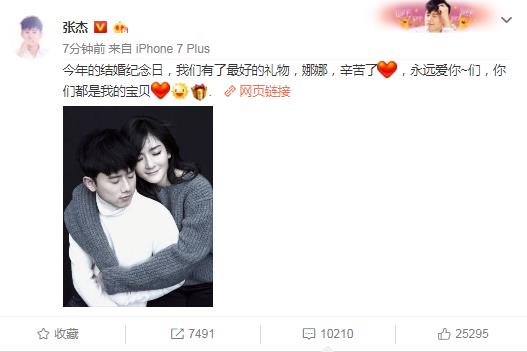 2017年9月26日,张杰发微博:“今年的结婚纪念日,我们有了最好的礼物,娜娜,辛苦了,永远爱你~们,你们都是我的宝贝!”网友瞬间炸开了锅,谢娜终于怀孕了。