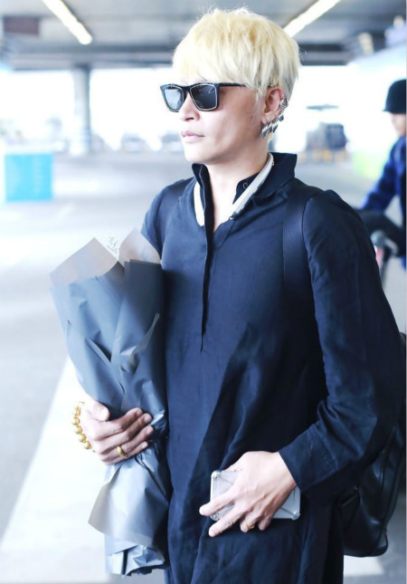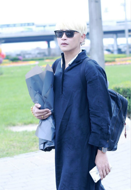 9月27日,北京,陈志朋现身机场解锁新造型,金发黑袍,扎耳洞变“五连环”,左脚穿纹身袜图案炫酷,在人群中格外显眼。