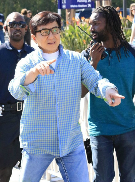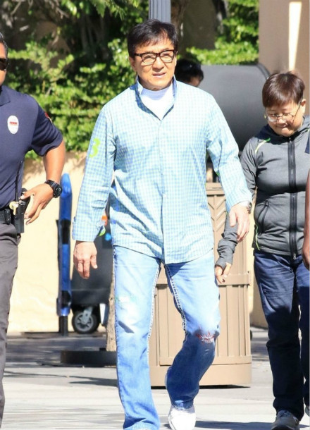 10月5日,成龙在洛杉矶环球商业街宣传自己的新电影《英伦对决》,成龙身材蓝色格纹衬衣和蓝色牛仔裤,阳光照在他的脸上,感觉成龙大瘦了好多。可以看到,成龙左边有一个高大的保镖,在太阳光底下走着,龙叔都是眯着眼的。