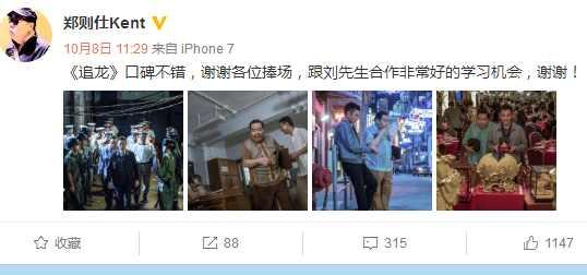 近日,著名演员郑则仕发微博庆祝《追龙》突破四亿:《追龙》口碑不错,谢谢各位捧场,跟刘先生合作非常好的学习机会,谢谢。郑则仕在剧中饰演刘德华(雷洛)身边的猪油仔,堪称最大牌配角。