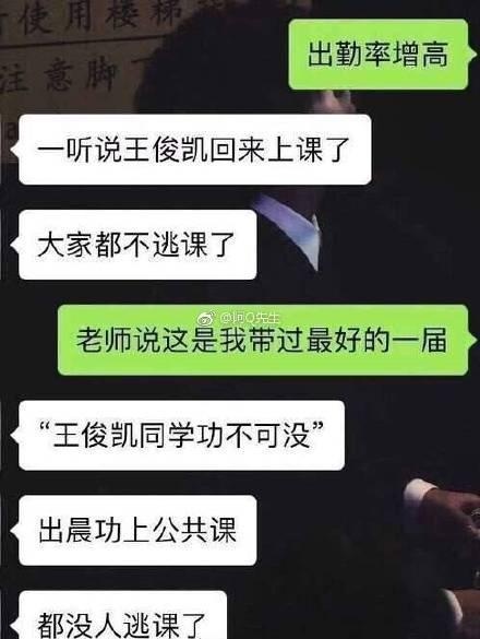 连北影的老师都在感慨:这是他带过的最好的一届,王俊凯功不可没啊!言外之意,往届的学生学习风气差,逃课的多。不知这位老师的自豪感从何而来,谁都知道,北影出勤率之所以提高,是因为这些学生都是想来看王俊凯的,而不是来听老师讲课的。