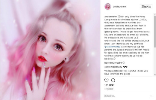 10月13日,吴卓林女友Andi在其个人的社交网站上晒出了自己的一张照片,并配上了一段文字,从这段文字可以看出,她们的爱得不到大多数人的祝福,相反遭到香港媒体的歧视,她们的住所遭到网友的骚扰,这让她们感到很无助。