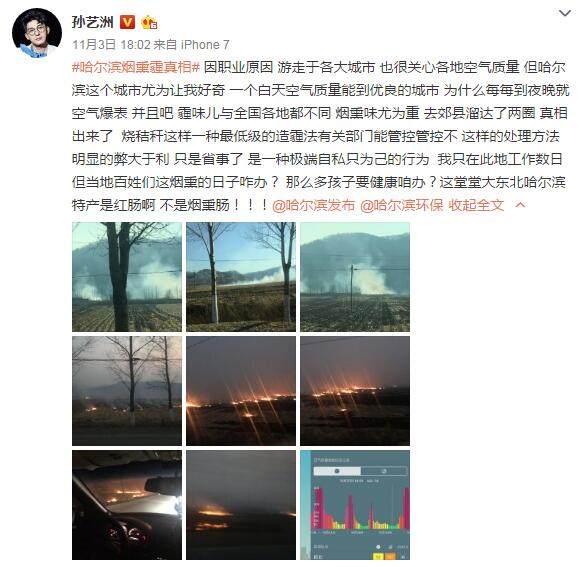 近日,演员孙艺洲在微博质疑为什么哈尔滨白天空气质量很好,但一到了晚上就漫天的烟熏味儿。孙艺洲最后发现根本原因是郊区焚烧秸秆造成的,并@了哈尔滨环保官方微博。