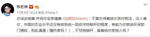 这些骂孙艺洲的网友大概是认为孙艺洲多管闲事,给哈尔滨抹黑,丢了哈尔滨人的脸。于是有些网友开始炮轰孙艺洲,并说出一些非常难听的话,但孙艺洲也不含糊,直接怼了回去。