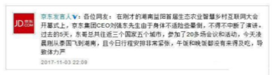 据了解,在过去的5天,刘强东一共往返了三个国家五个城市,并出席了20多场会议和活动!3号凌晨从泰国飞到湖南,且行程安排的非常紧张,并且午饭和晚饭都来不及吃,以至于体力严重透支。