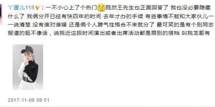11月8日,丫蛋发文正面回应和王金龙的离婚,称两人“分开已经快四年的时间,去年办的手续”,并且表示两人还是好搭档好朋友。