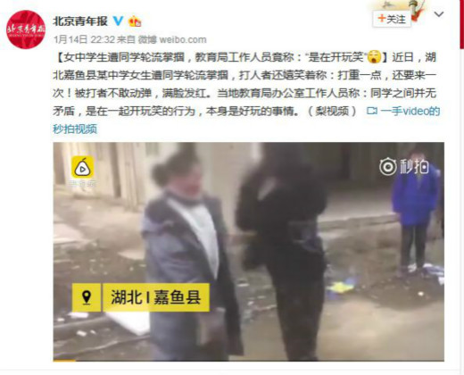 近日,湖北嘉鱼县某中学女生遭同学轮流掌掴,打人者还嬉笑着称:打重一点,还要来一次!被打者不敢动弹,满脸发红。当地教育局办公室工作人员称:同学之间并无矛盾,是在一起开玩笑的行为,本身是好玩的事情。