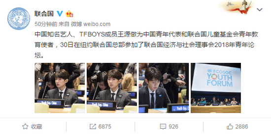 1月31日消息,据联合国官方微博消息,中国知名艺人、TFBOYS成员王源作为中国青年代表和联合国儿童基金会青年教育使者,30日在纽约联合国总部参加了联合国经济与社会理事会2018年青年论坛。