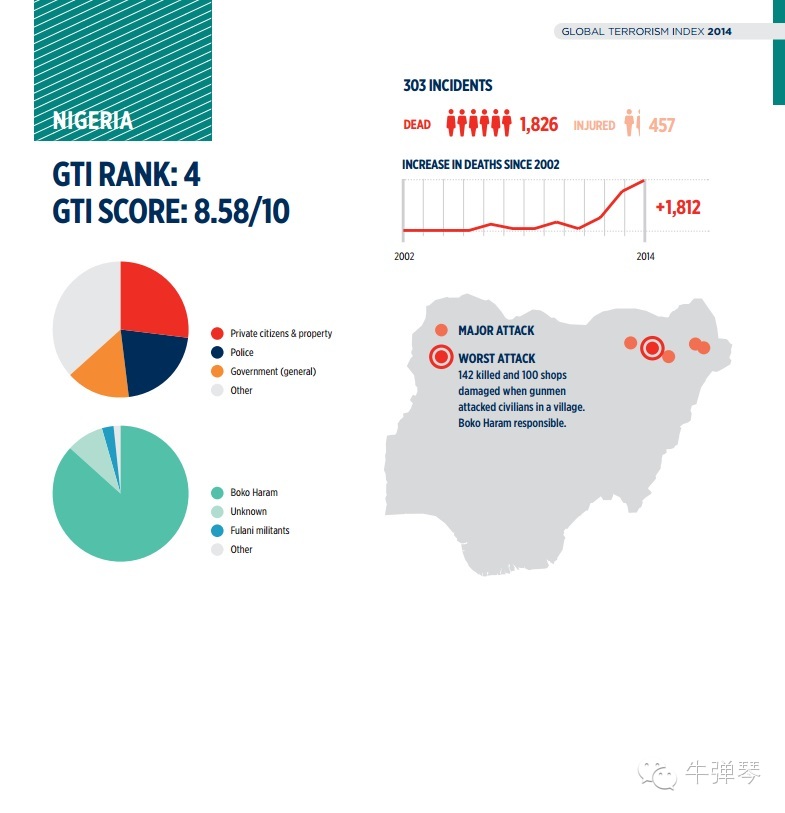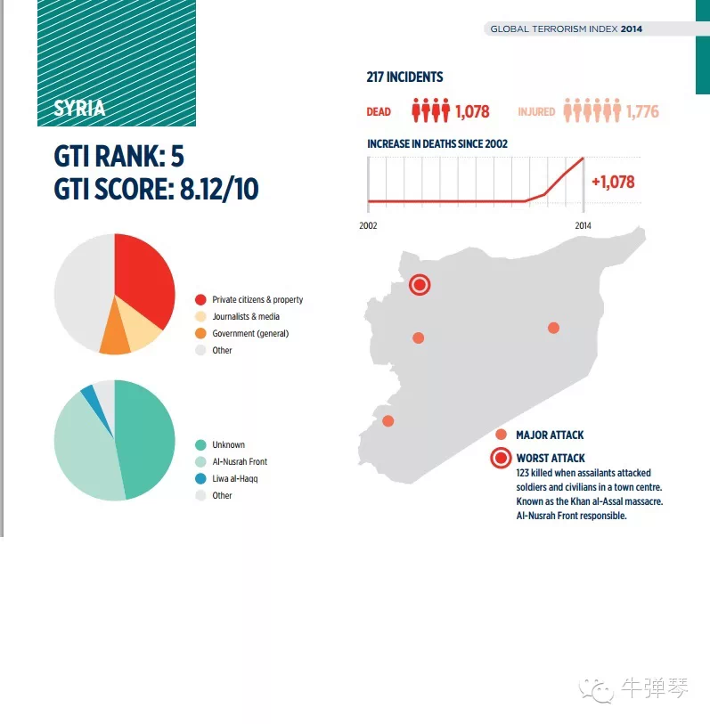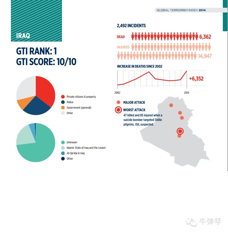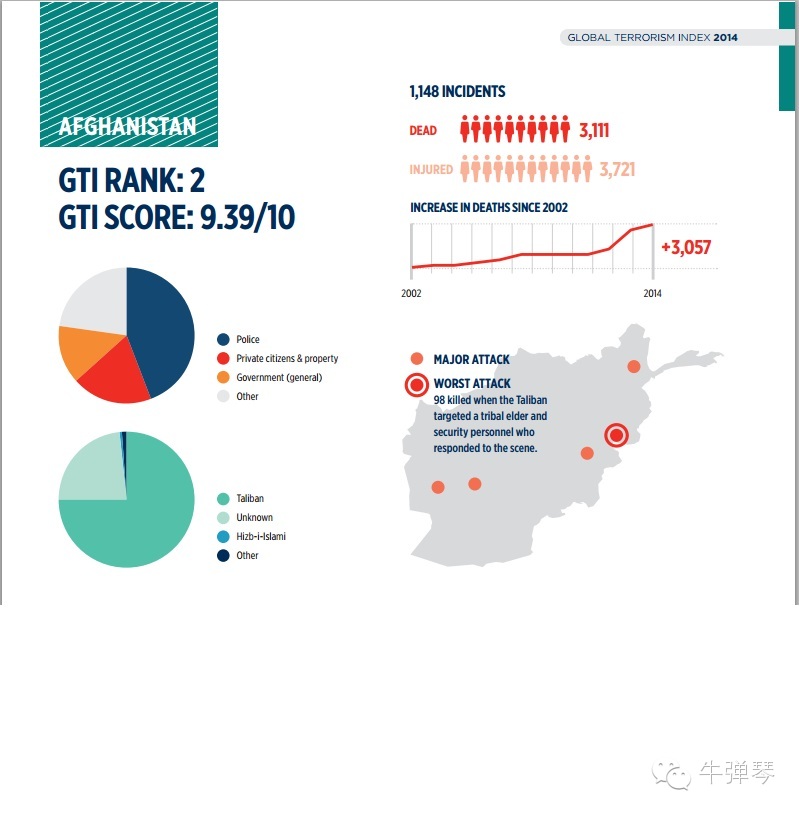 第二,82%的死亡来自五个国家:伊拉克、阿富汗、巴基斯坦、尼尔利亚和叙利亚。死亡之国啊!