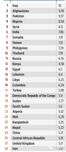 另外,中国排第25位,尽管西方统计机构定义的恐怖分子与我们有一些差异,但中国反恐形势严峻则是国际共识!