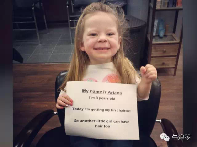 缅因州三岁小女孩ArianaSmith的照片被放上网络,随即走红。照片中她手持一张纸,上面写着:我是Arianna,今年3岁,今天我将第一次剪头发,希望能帮助另一个女孩得到头发。据悉,她是在看到一名癌症小病人剃成光头后,决定要帮助别人的。