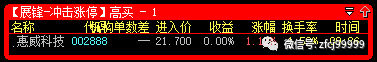11月7日9:27分冲击涨停预警(高买)的是002888惠威科技,开盘价21.70元,当日最低价21.35元,收盘价21.55元。而后取5个交易日最高点卖出,价格是22.49元,整体盈利仅为+3.64%;