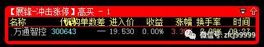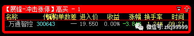 12月11日9:27分冲击涨停预警(高买)的是300643万通智控,开盘价19.55元,当日最低价18.80元,收盘价21.14元,暂取5个交易日最高点卖出,目前最高价格是21.88元,整体盈利达到+11.92%;