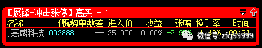 12月12日9:27分冲击涨停预警(高买)的是002888惠威科技,开盘价25元,当日最低价24.49元,收盘价24.04元,暂取5个交易日最高点卖出,目前价格是25.73元,整体盈利达到+2.92%;
