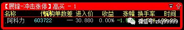 12月20日9:27分冲击涨停预警(高买)的是603722阿科力,开盘价30.88元,当日最低价30.65元,收盘价34.52元,暂按当日收盘价格27.65元计算,目前整体亏损达到+11.79%;;