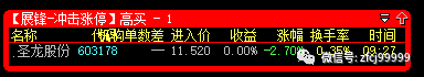 12月30日9:27分冲击涨停预警的是603178圣龙股份(高买),开盘价11.52元,当日最低价11.38元,收盘价11.90元,暂取5个交易日最高点计算,最高价格是14.47元,整体盈利达到+25.61%。