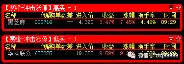 1月2日9:27分冲击涨停预警的是603825华扬联众(低买),开盘价19.30元,当日最低价19.20元,收盘价21.29元,暂取5个交易日最高点计算,最高价格是23.42元,整体盈利达到+20.41%;000716黑芝麻(高买),开盘价4.32元,当日最低价4.30元,收盘价4.58元,暂取5个交易日最高点计算,最高价格是5.04元,整体盈利达到+16.67%;