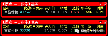 1月3日9:27分冲击涨停预警的是600242中昌数据(高买),开盘价9.05元,当日最低价8.93元,收盘价9.53元,暂取5个交易日最高点计算,目前价格是9.53元,整体盈利达到+5.30%;300551古鳌科技(低买),开盘价27.69元,当日最低价27.50元,收盘价27.99元,暂取5个交易日最高点计算,最高价格是27.99元,整体盈利达到+1.08%;