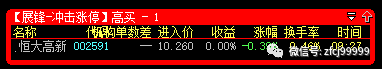 1月7日9:27分冲击涨停预警的是002591恒大高新(高买),开盘价10.26元,当日最低价10.26元,收盘价10.74元,暂取5个交易日最高点计算,最高价格是10.57元,整体盈利达到+3.02%;
