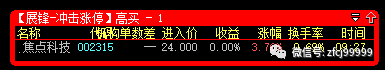 1月6日9:27分冲击涨停预警的是002315焦点科技(高买),开盘价24元,当日最低价22.06元,收盘价23.16元,暂取5个交易日最高点计算,最高价格是25.38元,整体盈利达到+5.75%。