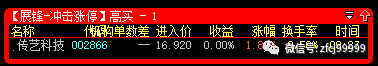1月10日9:27分冲击涨停预警的是002866传艺科技(高买),开盘价16.92元,当日最低价16.30元,收盘价17.30元,暂取交易日最高点17.30元计算,整体盈利达到+2.25%;