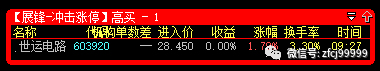 1月8日9:27分冲击涨停预警的是603920世运电路(高买),开盘价28.45元,当日最低价27.02元,收盘价27.45元,暂取5个交易日最高点计算,最高价格是28.46元,整体盈利达到+0.03%;