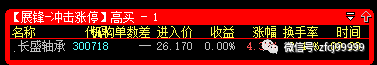 1月15日9:27分冲击涨停预警的是长盛轴承(高买),开盘价26.17元,当日最低价24.85元,收盘价25.43元,暂取5个交易日最高点计算,最高价格是25.93元,整体亏损达到-0.92%;
