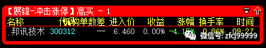 1月13日9:27分冲击涨停预警的是300312邦讯技术(高买),开盘价6.46元,当日最低价6.46元,收盘价6.69元,暂取5个交易日最高点计算,最高价格是6.67元,整体盈利达到+3.25%。