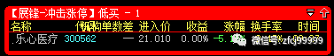 2月4日9:27分冲击涨停预警的是300562乐心医疗(低买),开盘价21.01元,当日最低价19.94元,收盘价21.59元,暂取5个交易日最高点计算,最高价格是23.80元,整体盈利达到+13.28%。(20.72元CYC1线处完全买得到)