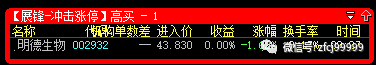 2月7日9:27分冲击涨停预警的是002932明德生物(高买),开盘价43.83元,当日最低价41.80元,收盘价42元,暂取交易日收盘价42元计算,整体亏损达到-4.18%;(43.69元CYC1线、42.94元CYC2线处完全买的到)