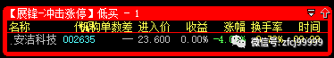 2月3日9:27分冲击涨停预警的是002635安洁科技(低买),开盘价23.60元,当日最低价22.50元,收盘价24.37元,暂取5个交易日最高点计算,最高价格是32.44元,整体盈利达到+37.46%。