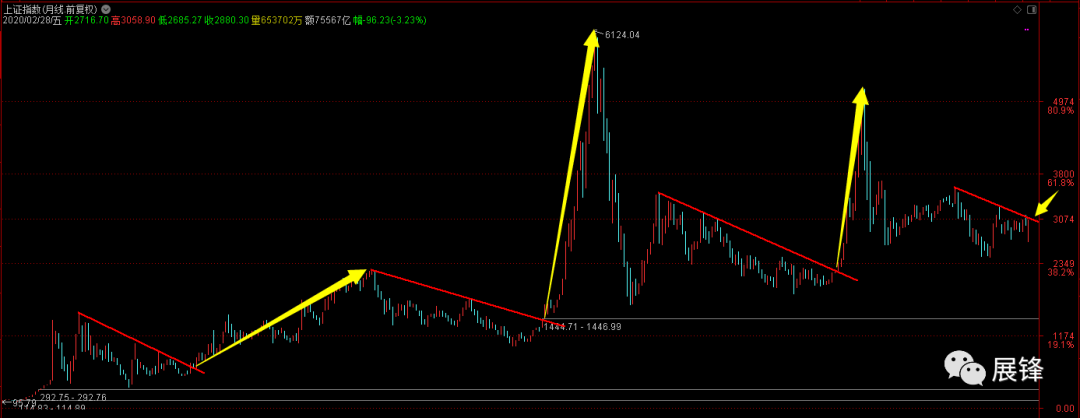我们再来看看A股的月线级别,上图是我讲课时多次画过的月线图,红色是下降压力线,指数想要走牛的话,必须要突破这个压力线,不管是6124的时候,还是5178的时候,都是如此的,二月指数曾经一度逼近该线,3月该线的压力大致在3066点附近,也就是说,未来A股想要出现技术性牛市,上面这根下降压力线,一定要被突破站稳,否则什么牛市都不要谈!
