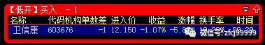 4月9日9:26分冲击涨停预警的是603676卫信康(低买),开盘价12.15元,当日最低价11.58元,收盘价11.99元,暂取5个交易日最高点计算,最高价格是13.19元,整体盈利达到+8.56%。(按成本均线买入法,12元是13日成本均线位置,11,81元是无穷成本均线位置,挂单完全可以买得到,按此分别买入的话,整体盈利+10.65%)