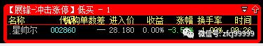 4月8日9:26分冲击涨停预警的是002860星帅尔(低买),开盘价28.18元,当日最低价26.94元,收盘价27.17元,暂取5个交易日最高点计算,最高价格是27.98元,整体亏损达到-0.71%。(按成本均线买入法,27.18元是5日成本均线位置,挂单完全可以买得到,整体盈利+2.94%)