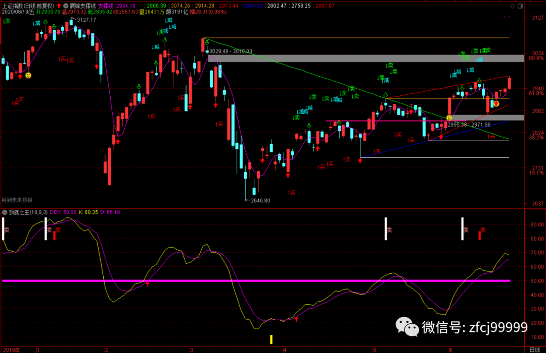 总结:6月15-12日大盘走出节节冲高的走势,周五最高触及上升压力位2973.44,收盘在我一直讲课提及的2967附近,下周注意顶底之王指标,不可以出现高位死叉,否则这个反弹就将就此终结!接下来,继续注意控制仓位,千万不要马虎大意,现在是比较关键的时刻,就算继续向上走,也要随时做好清仓或减仓的准备!