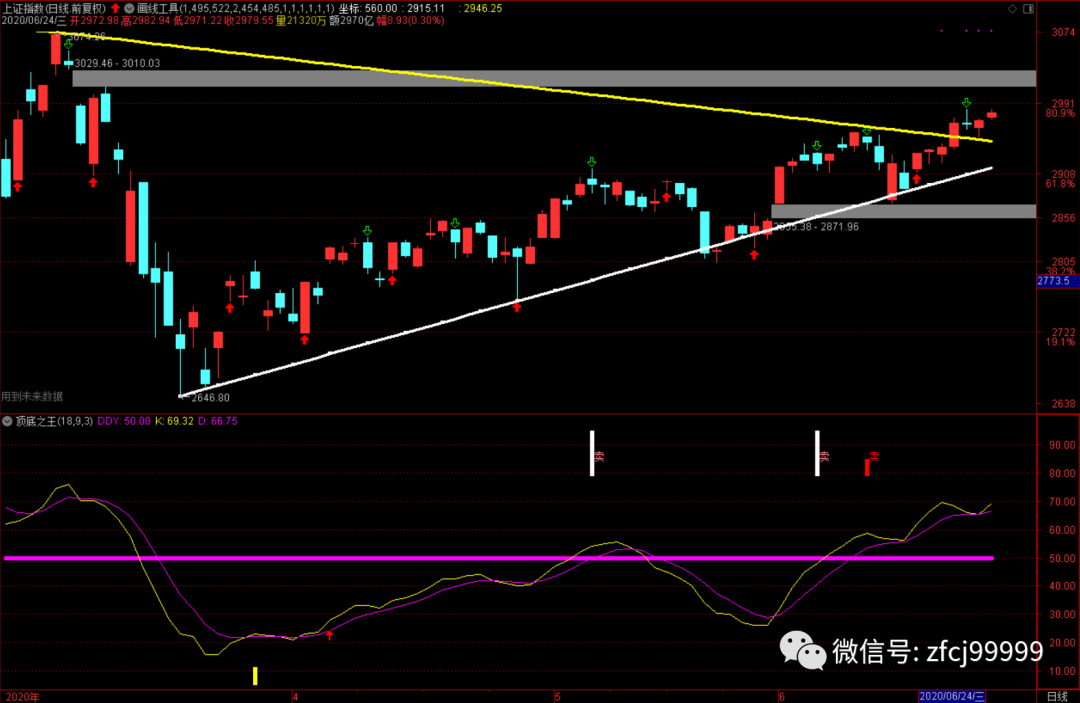 总结:6月22-24日大盘走势跌宕,周一收出阴十字星后,周二顶底之王出现死叉,为了烘托端午节日气氛,周三勉强上拉收红。纯技术角度而言,大盘上涨已经露出疲态,短期如果没有强有力的超强增量支持,恐怕继续上扬的难度会很大。所以,接下来要特别注意2962的支撑力度,一旦跌破的话,后面恐怕会非常的困难,建议目前不要大仓位操作,待一切明朗之后,再做图谋不迟!