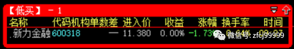 6月30日9:26分冲击涨停预警的是600318新力金融(低买),开盘价11.38元,当日最低价11.12元,收盘价12.74元,暂取5个交易日最高点计算,最高价格是14.74元,整体盈利达到+29.53%。(该股最佳买入位置是13日成本均线,价格大概是11.21元)