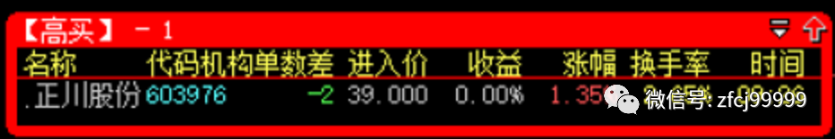 7月1日9:26分冲击涨停预警的是603976正川股份(高买),开盘价39元,当日最低价35.95元,收盘价40.60元,暂取5个交易日最高点计算,整体盈利达到+6.13%。(该股最佳买入位置是5日成本均线,价格大概是36.11元)