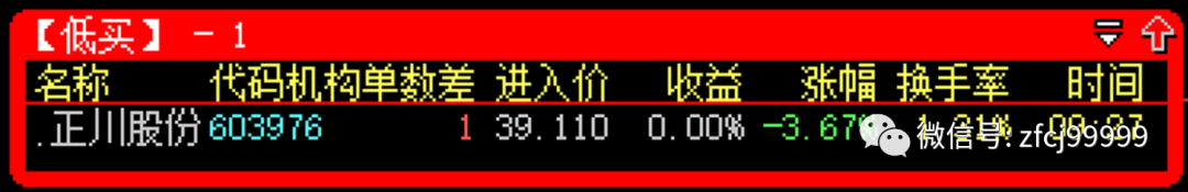 7月2日9:26分冲击涨停预警的是603976正川股份(低买),开盘价39.11元,当日最低价37.50元,收盘价38.49元,暂取5个交易日最高点计算,整体盈利达到+1.25%。