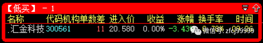 7月20日9:26分冲击涨停预警的是300561汇金科技(低买),开盘价20.58元,当日最低价19.13元,收盘价19.18元,暂取5个交易日最高点计算,最高价格是20.80元,整体盈利达到+1.07%。(该股最佳买入位置13日成本均线,价格大概是20.27元)