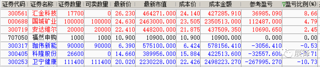 今天出了个国城矿业的零头,24.24元加仓了汇金科技,盘中又进行了汇金科技的高抛操作,做的还是蛮顺手的,最终汇金科技获利+8.66%,然后15.88元一脚踩入科隆股份,结果直接亏了-7.71%。安达维尔我没有进行高抛,因为我个人角度觉得,江龙船艇、新余国科、安达维尔就是军工板块的三个龙头,在震荡之后,后期应该还会有所表现!